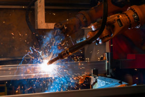 Welding,Robot,,Welds,Metal,Beams.,Modern,Welding,Production.,Bright,Flashes,
